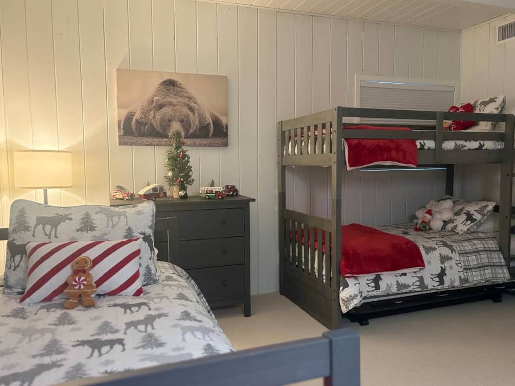Downstairs is the bunkroom, bathroom, and family room.