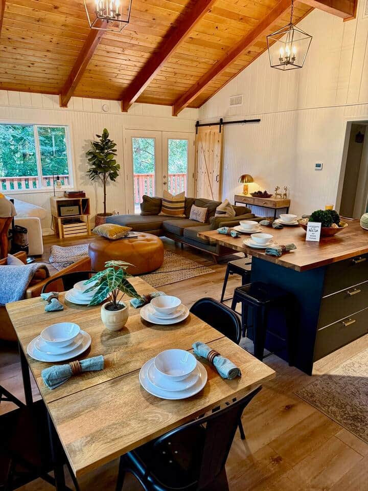 The Living Space provides a cozy modern interior with a wood burning fireplace. Plenty of seating and access to the outside deck. Get cozy on one of the couches and watch a movie in front of one of two fireplaces, yes two! Throw blankets, pillows and comfortable rooms to make sure you and your guests feel right at home.